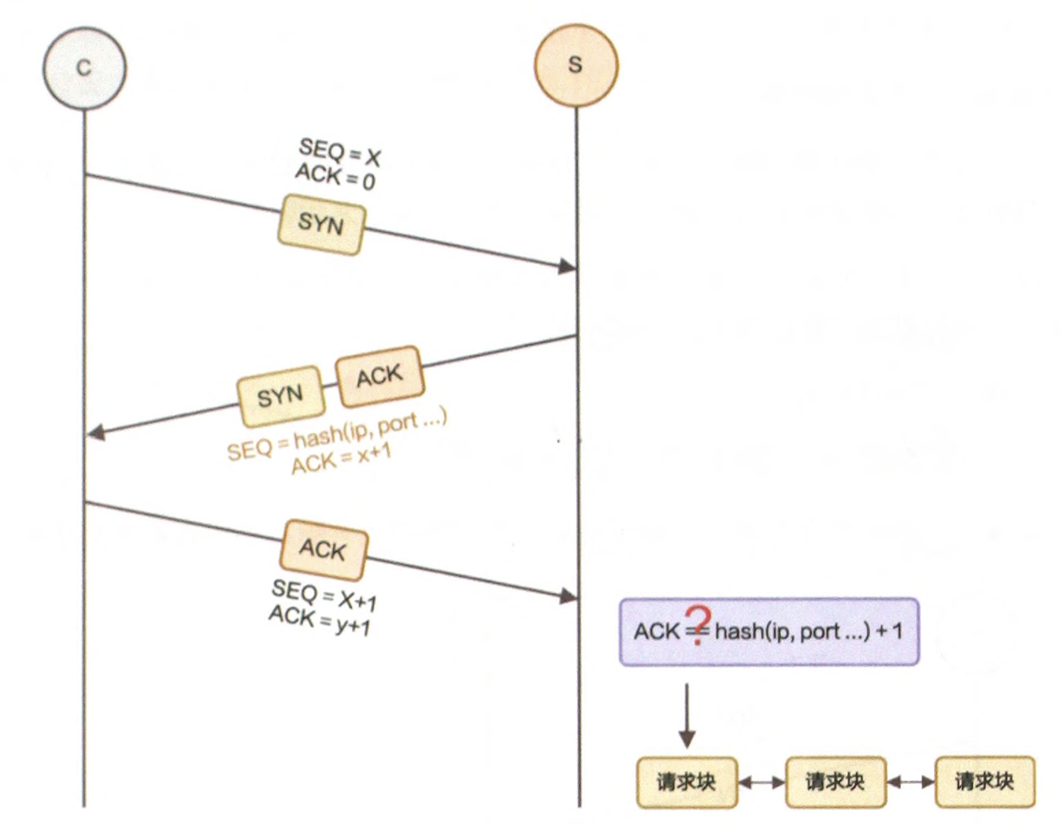 - SYN Cookie 第二次发给客户端的序列号是一个哈希值,第三次握手时计算哈