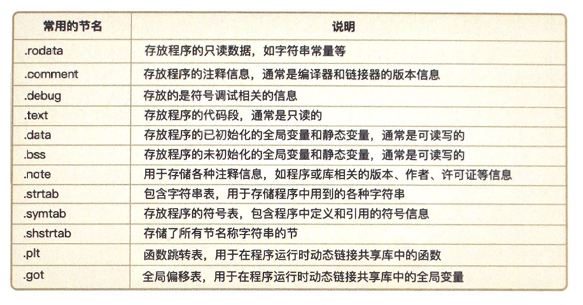 - 节 存放ELF文件的数据,比如静态数据、代码指令、调试信息