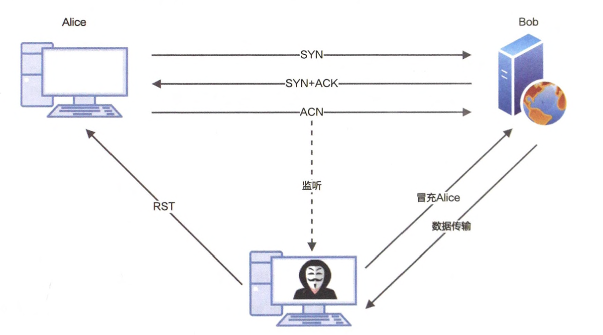 - 中间人攻击 监听网络通信拿到通信的序列号和确认号,伪造进行通信